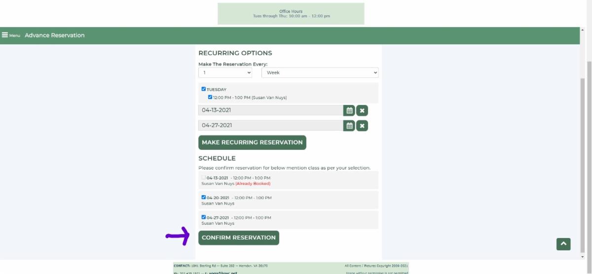 The schedule of classes within the dates you've selected will appear, with any remaining classes preselected. You may click to unselect any classes you do not want to attend. In this example, the student had previously registered for the 4/13 class and the system prevents double booking by making it unavailable. Select "Confirm Reservation". You will get confirmation that you are booked for those classes, along with the option to go in and book more classes if you would like. As always, if you want to double check your registration, go back to the main menu, and choose Attendance to see your upcoming classes.
