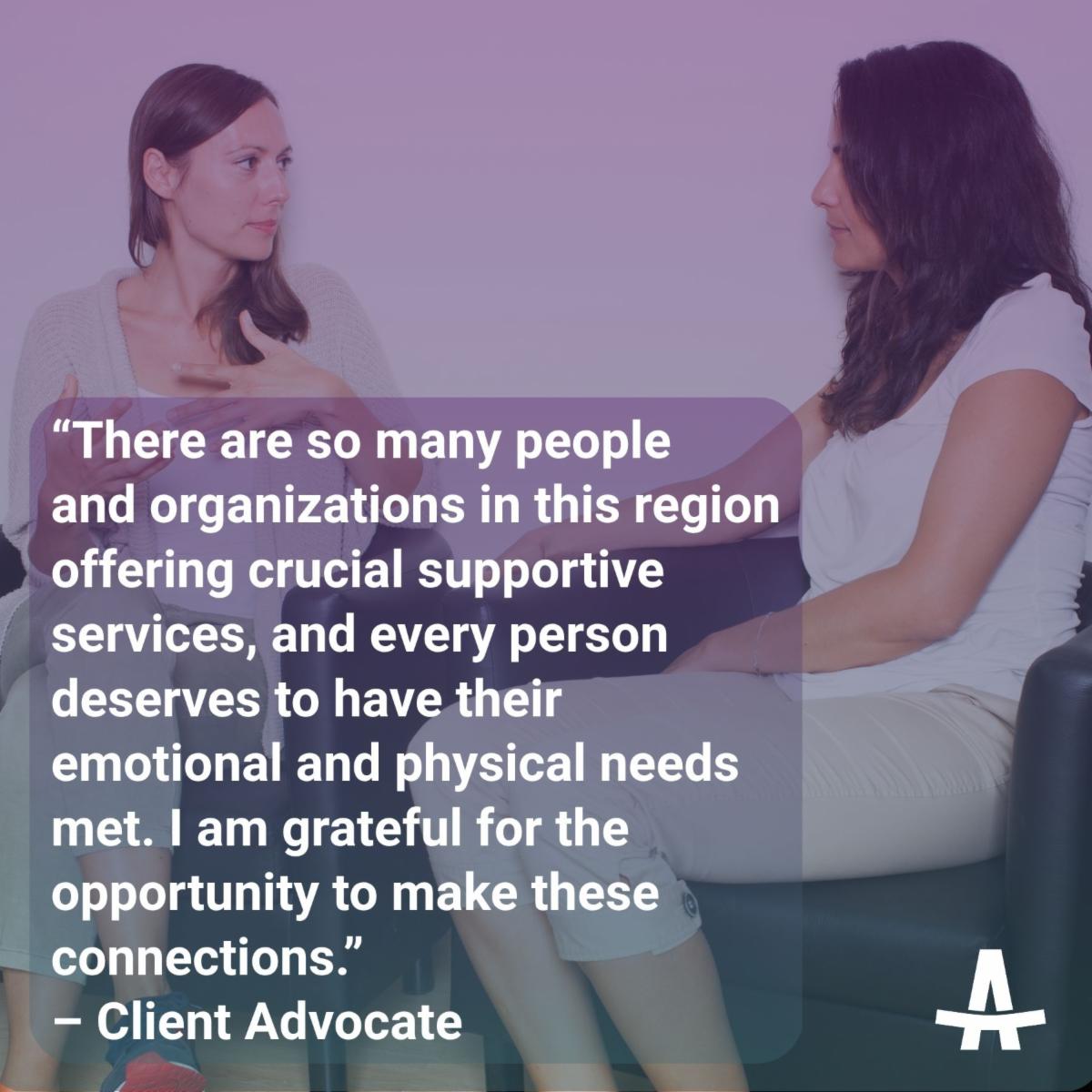 When our clients face complex legal and emotional challenges, they can rely on our Client Advocates to walk alongside them every step, offering safety planning, emotional support during legal meetings, and guidance in navigating vital resources.