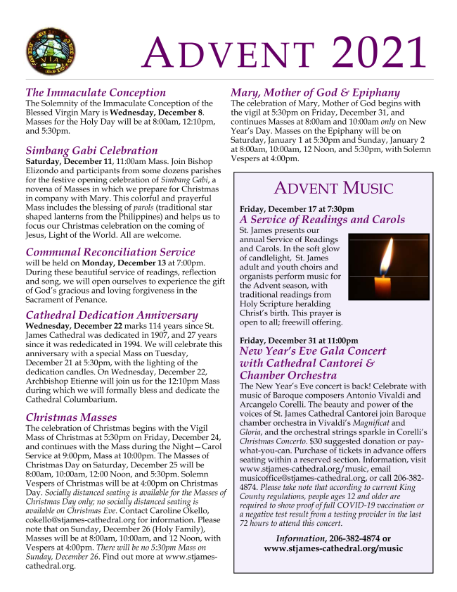 CATHEDRAL DEDICATION ANNIVERSARY Wednesday, December 22 marks 114 years since St. James Cathedral was dedicated in 1907, and 27 years since it was rededicated in 1994. We will celebrate this anniversary with a special Mass on Tuesday, December 21 at 5:30pm, with the procession and lighting of the dedication candles. On Wednesday, December 22, Archbishop Etienne will join us for the 12:10pm Mass during which we will formally bless and dedicate the Cathedral Columbarium.