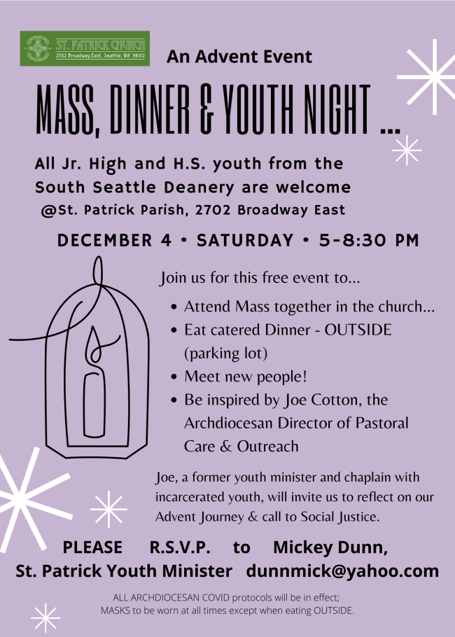 ADVENT GIVING TREE AND SOCK DRIVE Consider sharing a gift with someone who may not receive anything during this upcoming Christmas season. Stop by the Mary Shrine to pick a tag off our annual Giving Tree, or visit the Cathedral’s virtual Giving Tree. Each tag contains a gift wish from someone in need in our community. Our Annual “Warm Hearts and Soles” Advent Sock Drive is also underway! Our Goal: 2,022 pairs of socks for homeless men. Both giving programs are easy and fun to participate: simply shop for the item and return it after Sunday Mass in the Cathedral Chapel or Bookstore or have it shipped to the Parish Office by Sunday, December 12. Information, Patrick Barredo, 206-382-4515 or pbarredo@stjames-cathedral.org. Thank you!