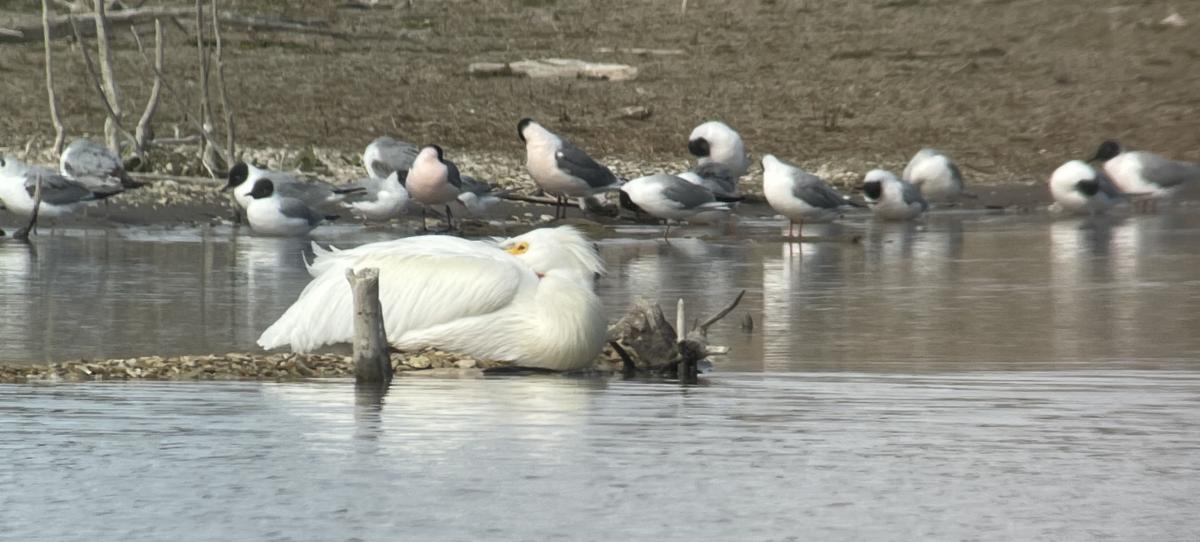Photo by JK Augustine of American White Pelican (foreground) and Franklin's Gulls (background) at Webster State Park.