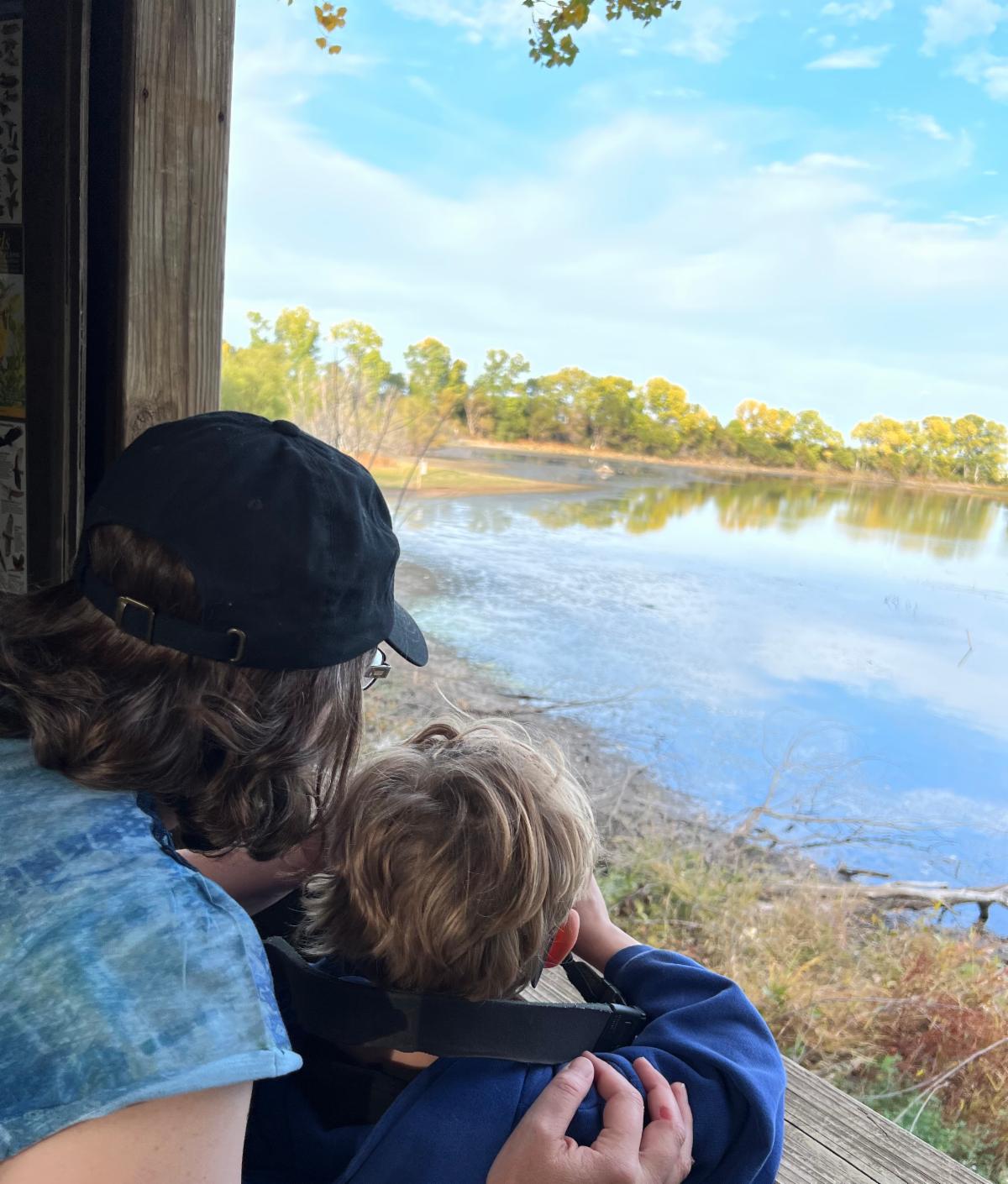 Photo of two people looking out of the bird blind at Smoky Hills Audubon Wildlife Sanctuary. Photo by K Hurst.