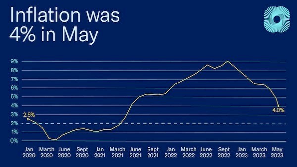 The Consumer Price Index, the broadest measure of consumer prices, rose 4% annually in May but was down from April, when it was 4.9% and well down from the peak of 9.1% in June 2022.