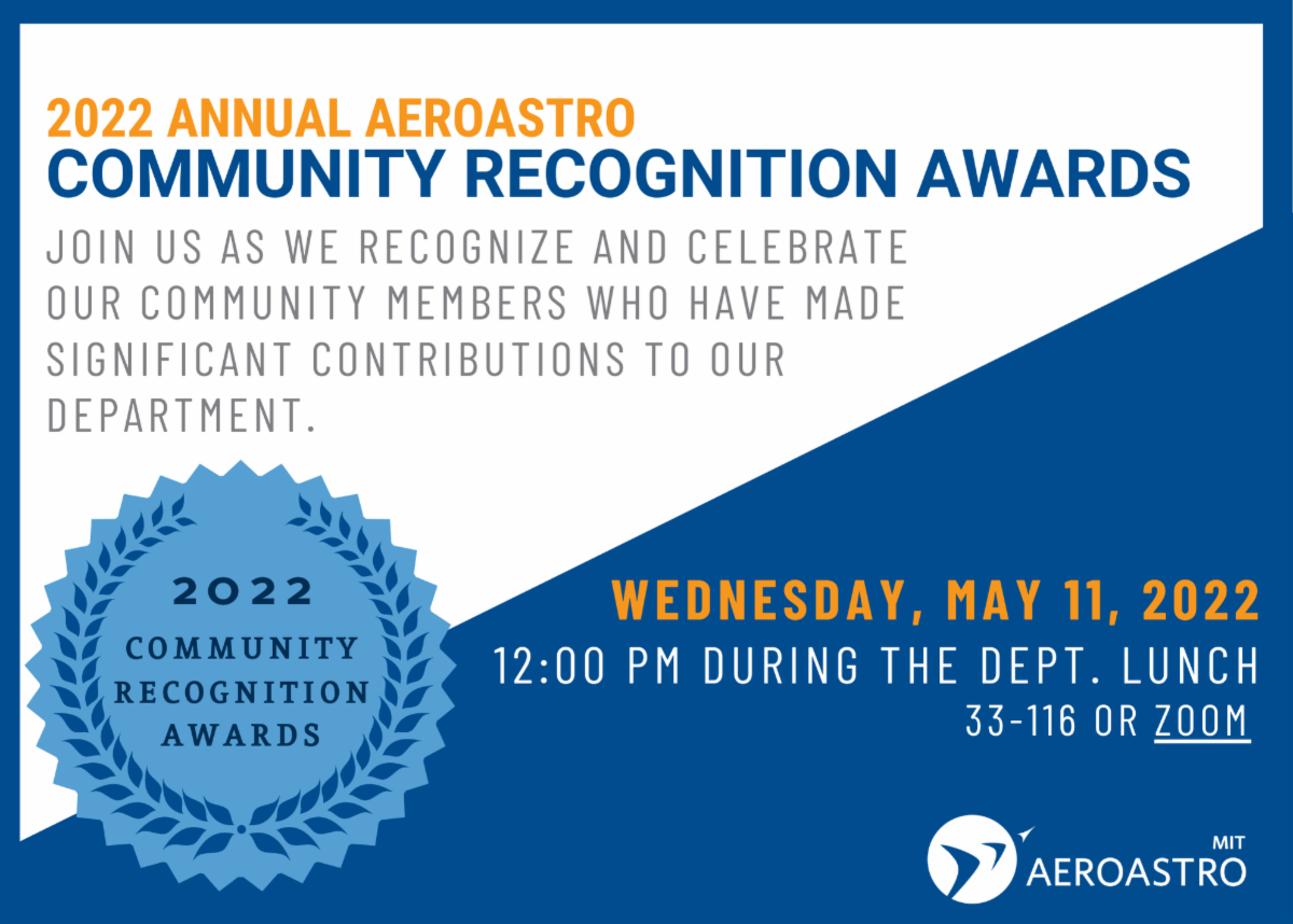 The votes have been counted! Now it's time to come celebrate your colleagues for this year’s Community Recognition Awards ceremony! Join us on Wednesday, May 11 at noon in person in 33-116 or on Zoom.