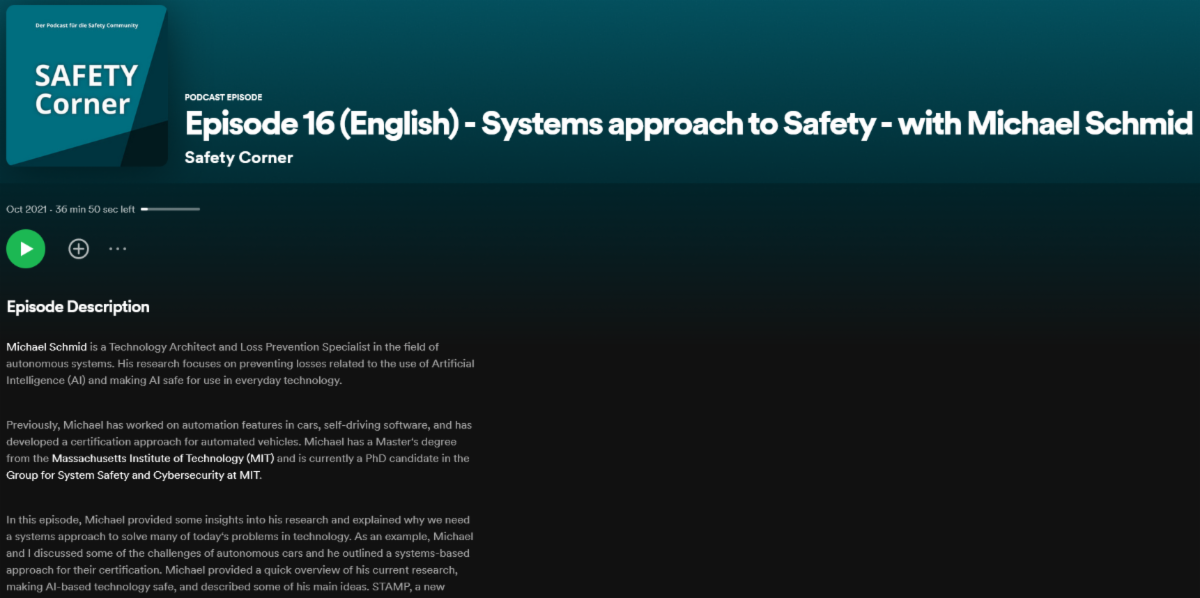 Michael Schmid was featured on the podcast “Safety Corner," where he discussed a systems approach to safety. He explained how a systems approach to safety is more effective than what is done currently and how he applies this approach to his research, which focuses on making artificial intelligence safe for applications such as autonomous cars, autonomous air vehicles, and other tasks that are safety-critical. Listen on Spotify.