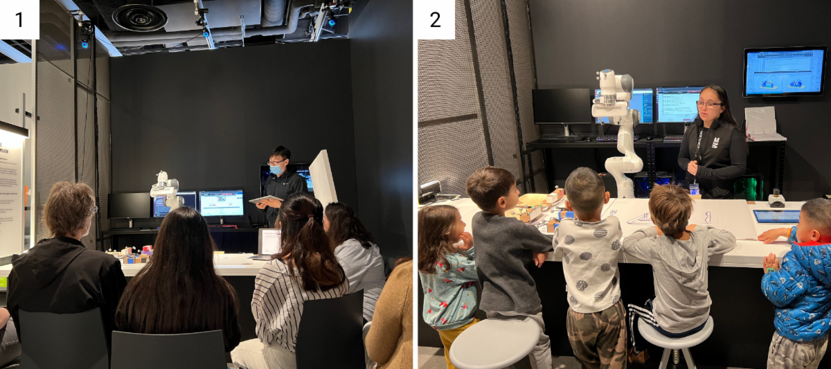(2) Julie Shah's daughter Lily (age 4) and son Luca (age 6), and their friends interacting with the robot on opening day.
