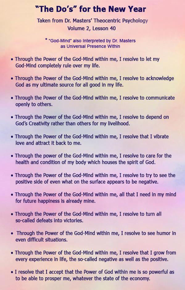 Over the course of his lifetime of service, Dr. Masters presented a large number of inspirational lectures during his Sunday services. Presented here are those given between 2006 and 2008. Almost all of them began with a meditation or healing treatment, after which he presented a teaching and included an affirmation.