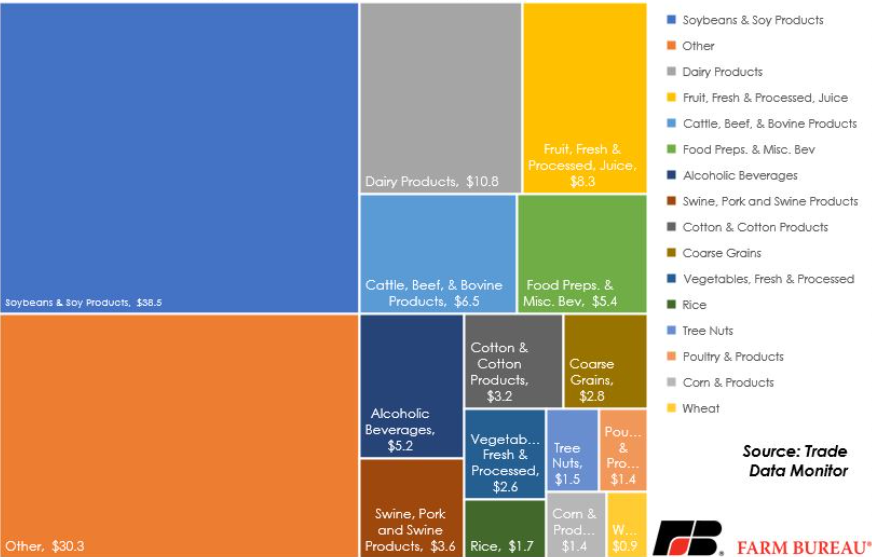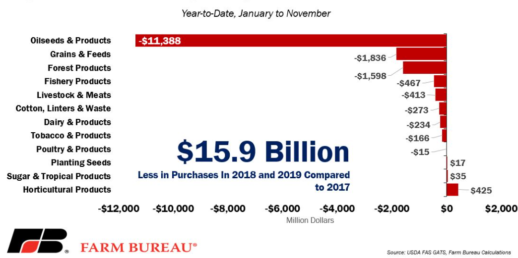 China will return to the table as a significant buyer of U.S. agricultural goods under the Phase One trade agreement signed January 15. Chinese purchases of U.S. agricultural products averaged over $25 billion between 2014-2017 prior to the trade disruptions. In 2018, after the outbreak of tensions, Chinese purchases fell to $13 billion. Through November of last year, purchases equaled just $12 billion. Figure 1, created by American Farm Bureau (AFBF), shows the change in export value of U.S. goods sold to China in 2018 and 2019. In total, lost U.S. agricultural export sales over the last two years equaled nearly $16 billion compared to 2017.