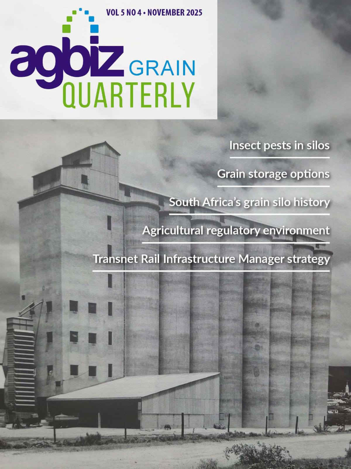Agbiz Grain Quarterly is an online magazine dedicated to the South African grain handling and storage industry. In addition to the usual offering of thought-provoking, industry-specific articles, the November 2025 issue highlights the grain silo history of South Africa and explores the importance of prioritising preventative silo maintenance to ensure safety and preserve grain quality during long-term storage. This issue also features coverage of Sacota’s AGM and the challenges faced by the grain and oilseeds sector, TRIM’s strategic outlook for the industry, and insights on hazardous substance transport. Readers can further explore articles on the influence of commodity type and temperature on insect infestations in silos, grain storage options, updates in the agricultural regulatory environment, and managing flammable storage compliance in South Africa and much more. To download the current PDF version of Agbiz Grain Quarterly, click here. To download the digimag, click here.