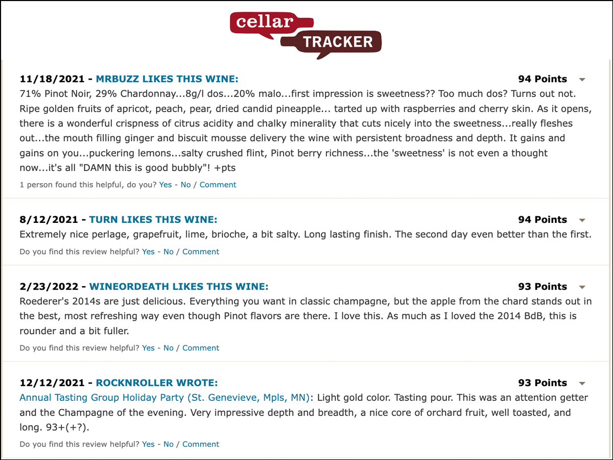 “Roederer's 2014 Brut Vintage is beautiful, offering up aromas of pear, mirabelle plum, red berries, warm biscuits and smoke. Full-bodied, layered and elegantly muscular, it's seamless and complete, with terrific mid-palate depth and amplitude. Framed by bright acids and enlivened by a pinpoint mousse, it concludes with a penetrating finish. The blend is 70% Pinot Noir, emphasizing Verzy, and pressure is a touch higher than in its more ethereal Blanc de Blancs counterpart. As I wrote of its 2013 predecessor, this is a wine that puts many prestige cuvées to shame.” —William Kelley (September 23, 2021)