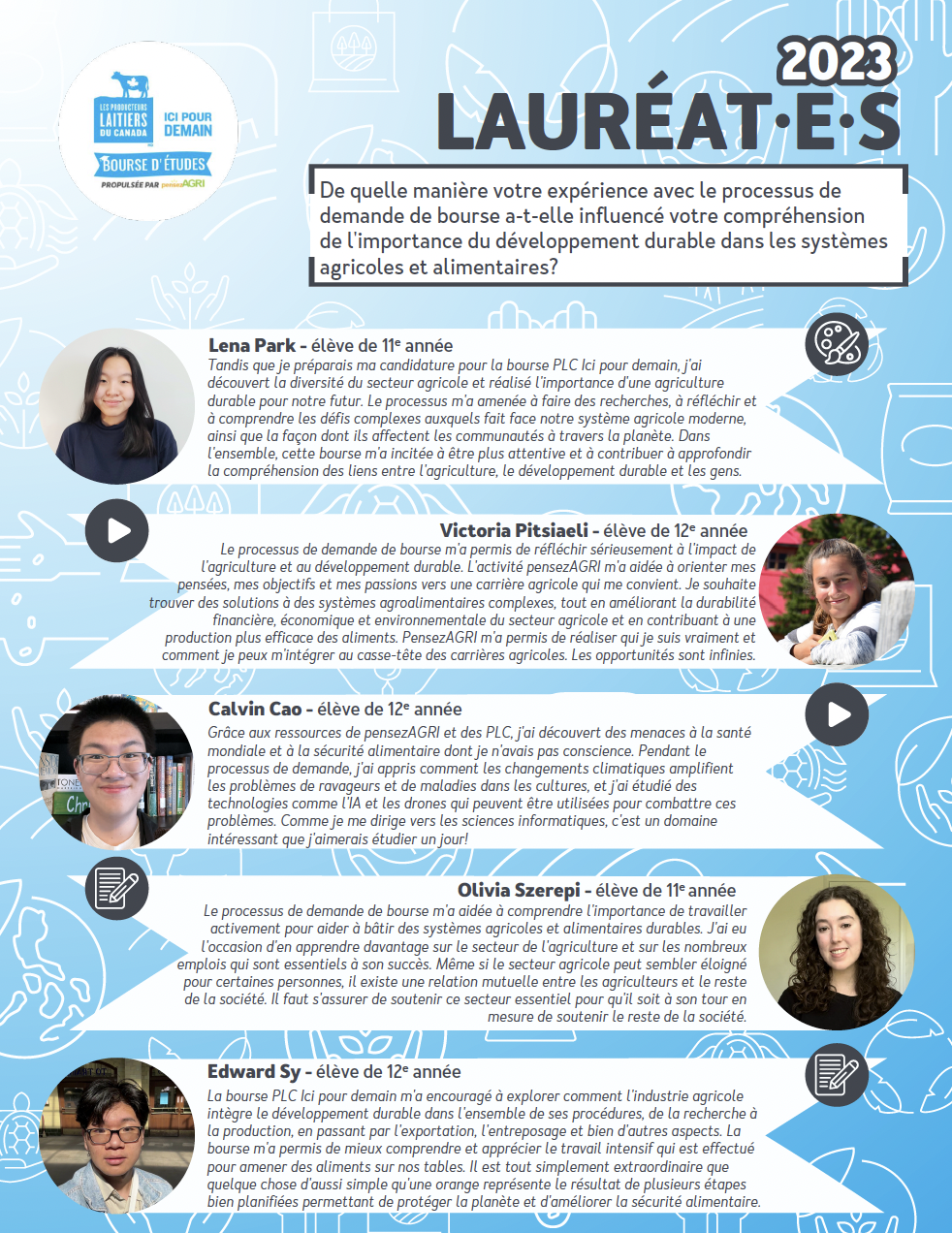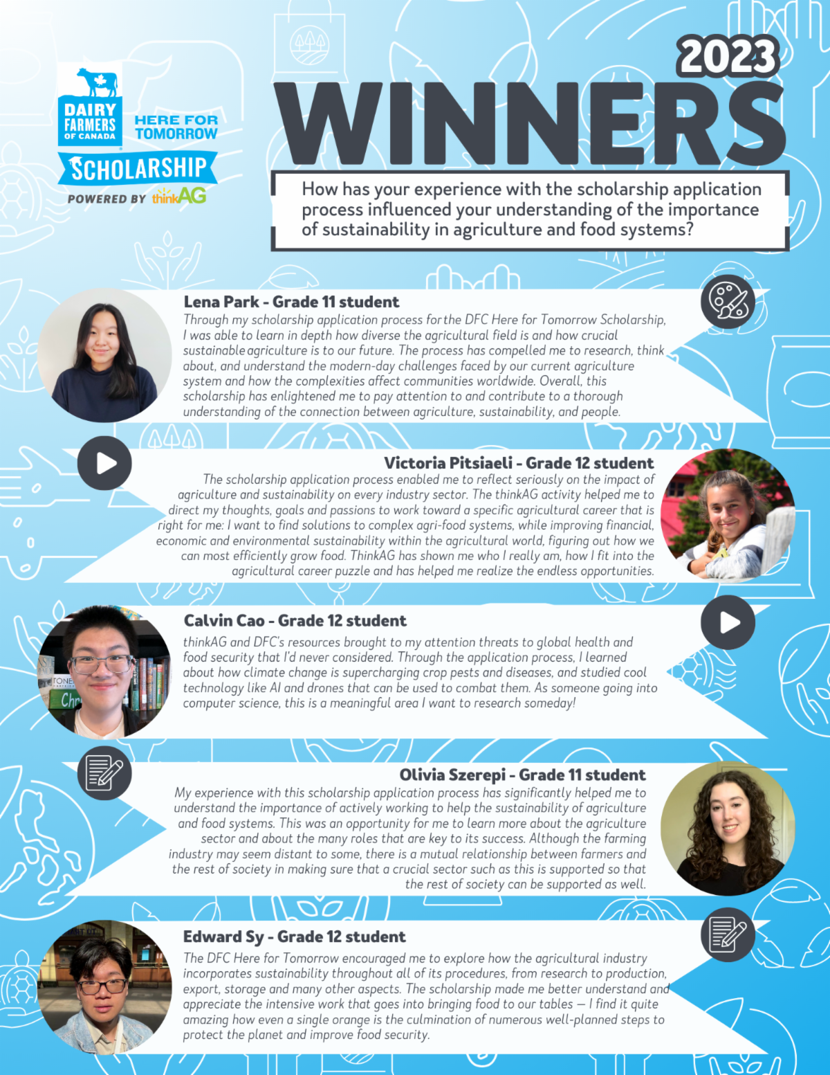 “In supporting the DFC Here for Tomorrow Scholarship (powered by thinkAG), our goal was to encourage young Canadians to explore careers in sustainable agriculture, by helping them recognize how they could apply their knowledge and skills in this burgeoning field,” said Pierre Lampron, President, Dairy Farmers of Canada. “We are extremely proud of all of this year’s entrants and congratulate the 2023 recipients.”