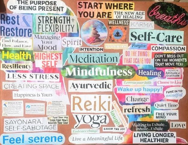 There are a lot of different ways you can create a vision board, including, but not limited to using magazine clippings, using your own photos, or even doing it digitally online. What the vision board showcases is up to you. Some people like to find images of different ways they relieve stress, some people like to create goals through images, and some people just like to make a nice-looking board that provides them stress relief just by looking at it. The organization of the board is also up to you but usually looks like a collage.