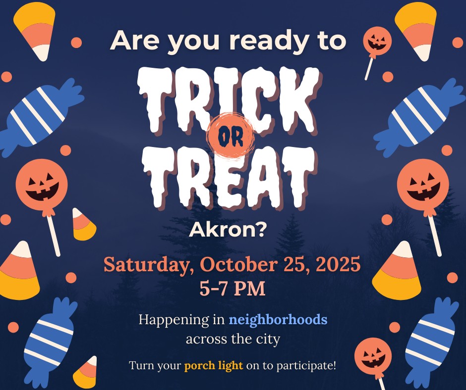 In 2008, Akron City Council passed Ordinance No. 419-2008 declaring the last Saturday in October from 5:00 to 7:00 p.m. as "Trick or Treat Night" in the City of Akron. Establishing a uniform date and time for trick or treating in the City eliminates confusion and allows for greater security and a safer environment for the participants. Citizens who wish to participate may indicate this by turning on their porch lights.