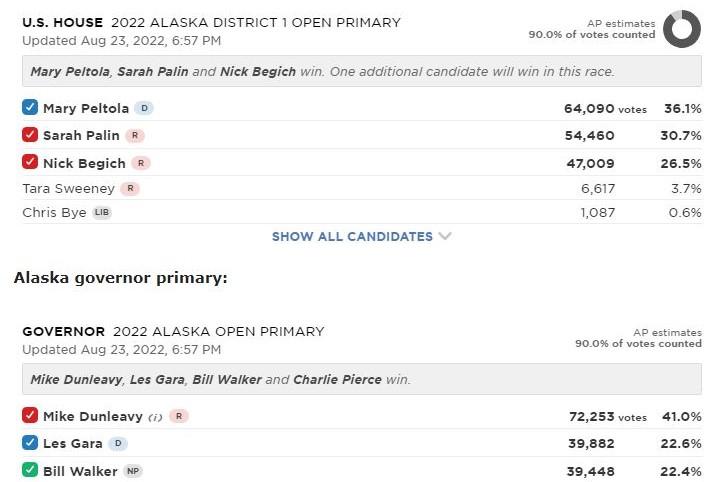 In this special three-way, Mary Peltola has a 7.5 point lead over Sarah Palin so far. It looks like it will be third-place finisher Nick Begich who will be eliminated. His are the only ballots that will be re-allocated. But imagine if it was a tighter race, with Begich and Palin switching places with each update. Sometimes it would be the Palin ballots that get reallocated. The preliminary results would swing wildly. We’d run out of confetti and tears.