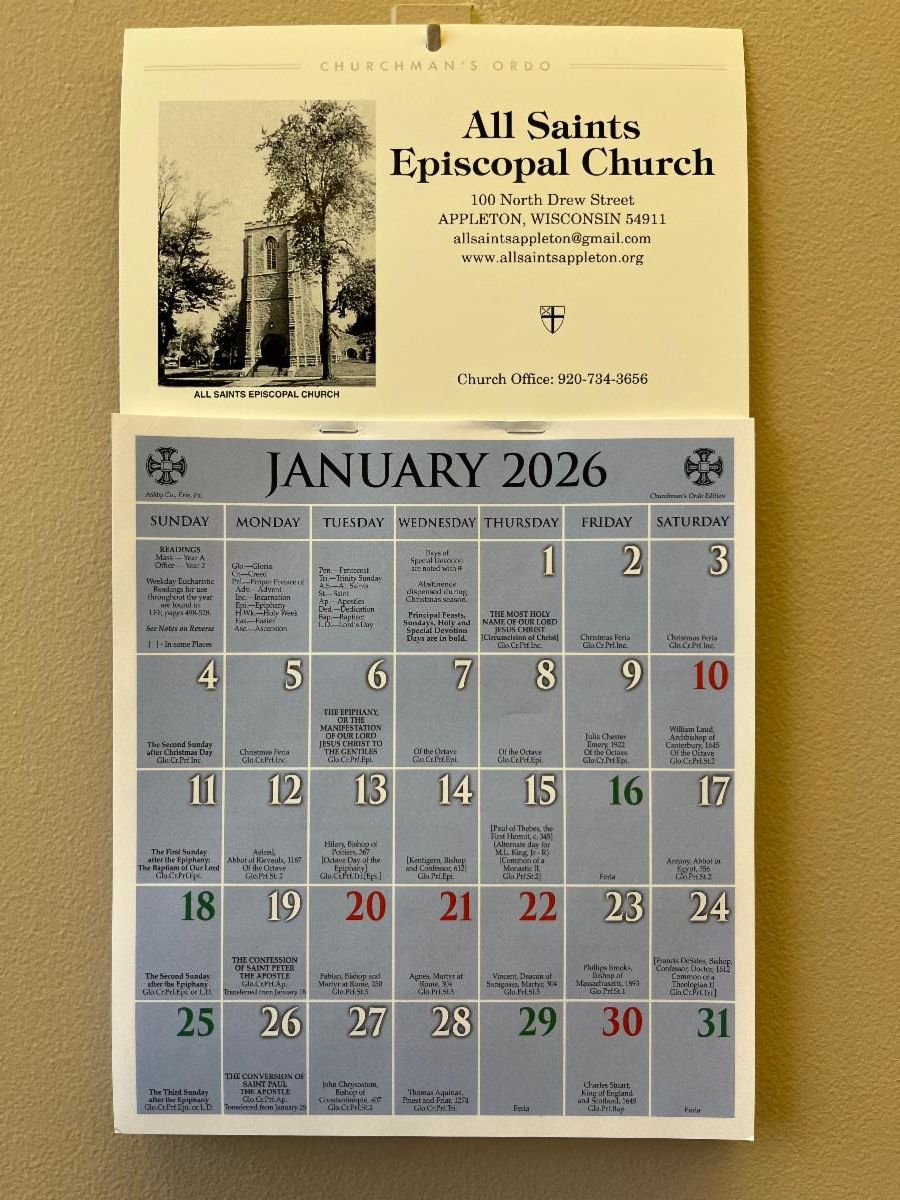 | | The parish office will be closed Dec. 31-Jan. 1. | | Meetings with Bishop Matt | On Thursday, January 15 at 2pm and 6pm, Bishop Matt Gunter will be at All Saints to answer questions and discuss the future of the parish. Please attend one of these sessions if you're able; we want everyone to feel heard as we go through this time of transition. Bishop Matt has also written a thoughtful letter to the members of All Saints, which was sent out via email and snail mail on Dec. 18. A few extra copies are available in the office for anyone who would like one. | | Volunteers from All Saints will be serving dinner at the Pillars Adult Shelter on Tuesday, January 6 from 5:30-8pm. Fr. Patrick Twomey will cook the food in advance, but we need volunteers to help serve and clean up. Please sign up on the Outreach bulletin board or contact the office! | | The new Ordo Calendars for 2026 have arrived! They're useful for tracking the seasons of the church year; the color of the date matches the vestments and hangings to be used in church, and the back of each month's page lists the readings for Sundays and holy days. Highly recommended for lay servers, altar guild members, and church nerds of any sort. Stop by the office, the Palmer Room, or the shelf by the lift and pick one up for free! | | Continued Call for Servers | |