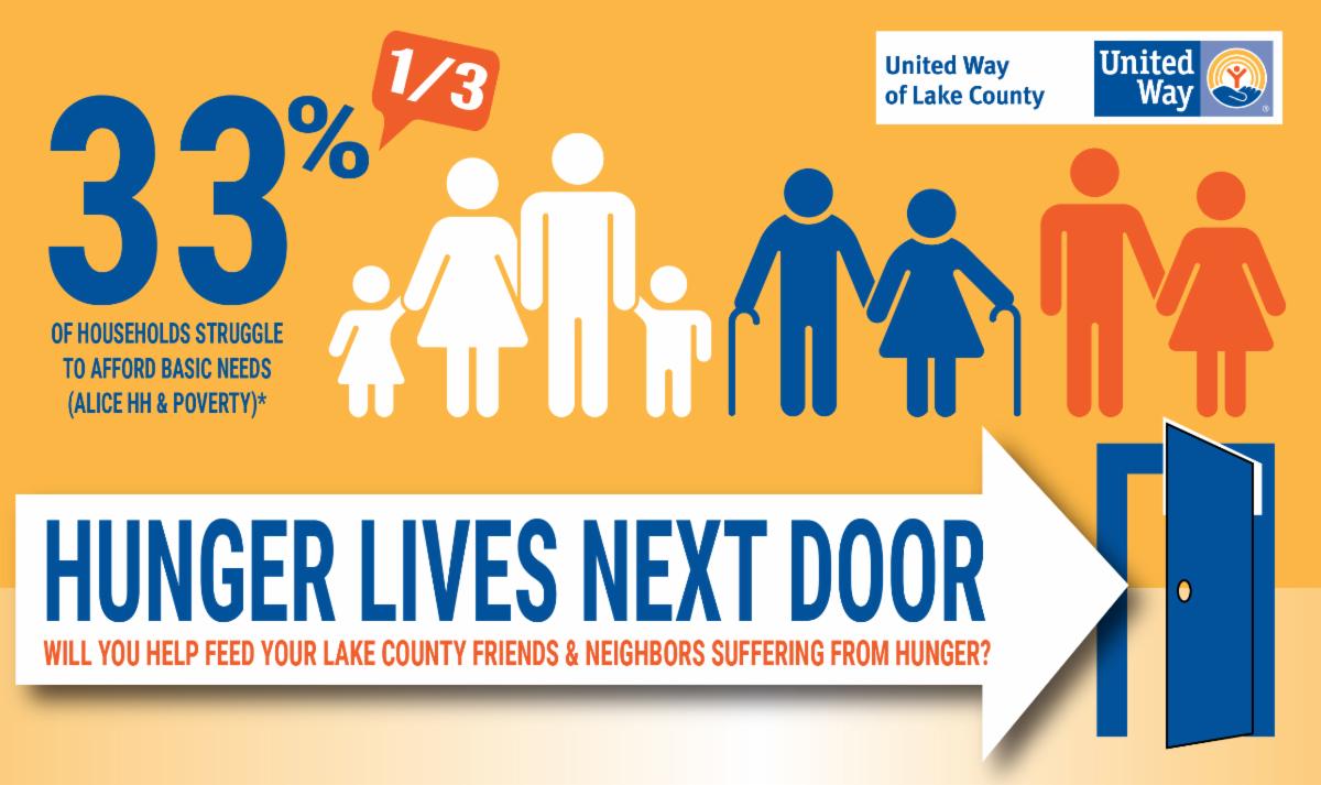 Our 32nd Annual Feed Lake County Food Drive and Fundraiser kicks off March 1st, and we implore you to join us in our fight against hunger. In Lake County, 33% of households struggle to afford basic needs.* This sobering statistic highlights the urgency of our mission to alleviate hunger so no child goes to bed hungry and no parent or individual grapples with uncertainty over their next meal.