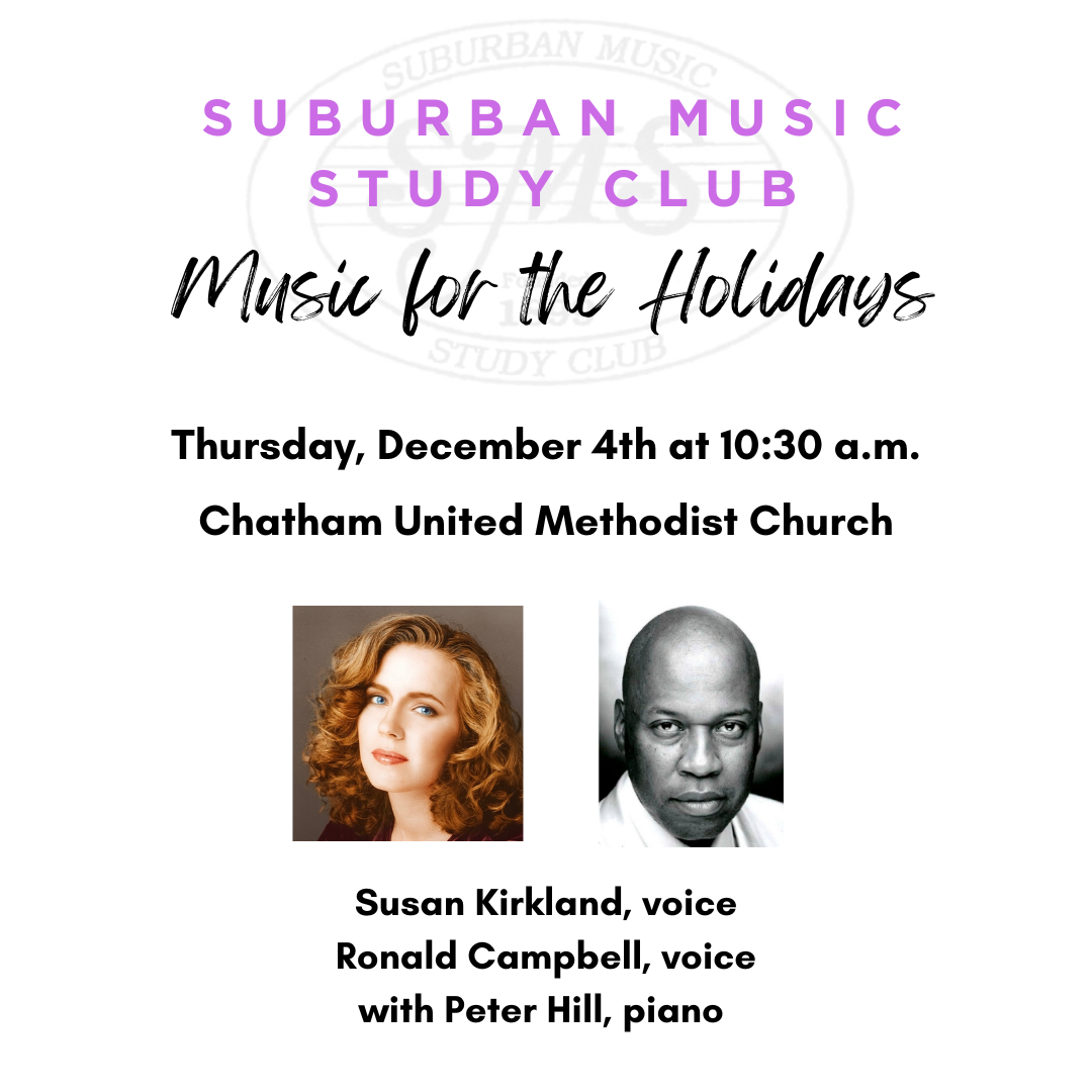 The next concert taking place in Chatham UMC’s sanctuary will be Music For The Holidays, a festive program of classical and holiday music with vocalists Susan Kirkland and Ronald Campbell hosted by The Suburban Music Study Club. All are invited to hear this free program on Thursday morning of December 4th at 10:30 am See you there!