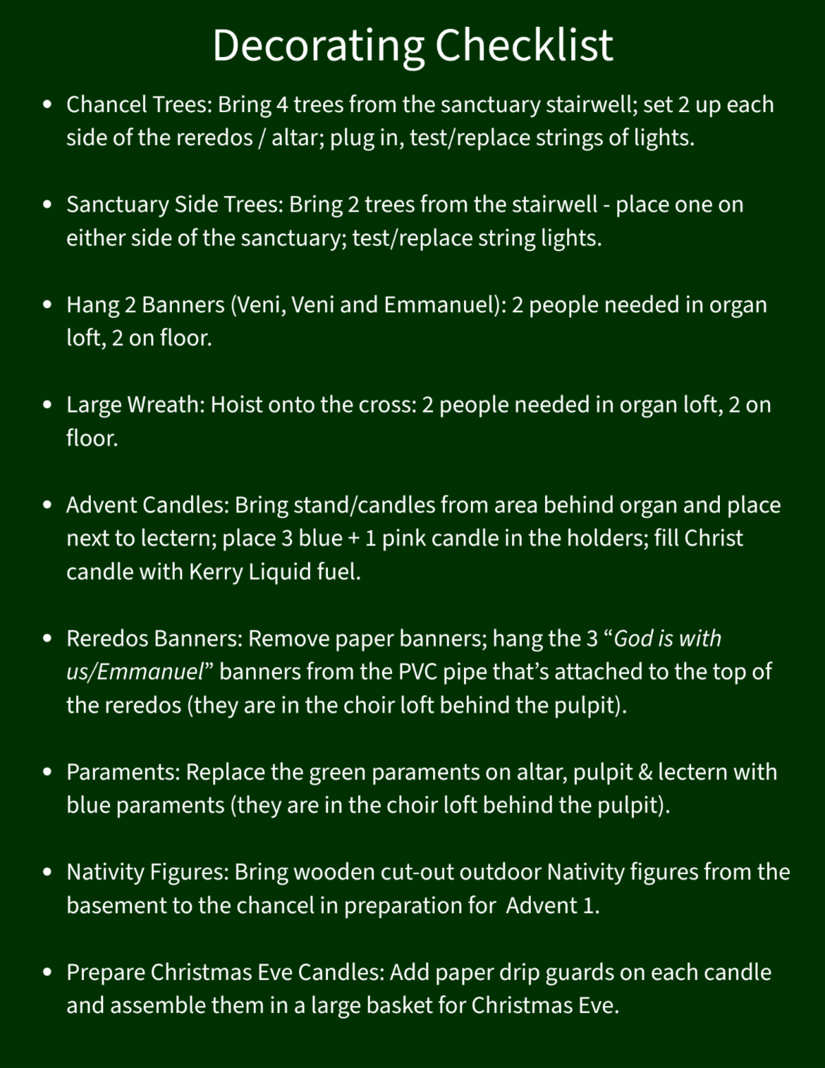 - Nov 23rd - Decorate the Sanctuary for Advent and Christmas 11:15 am