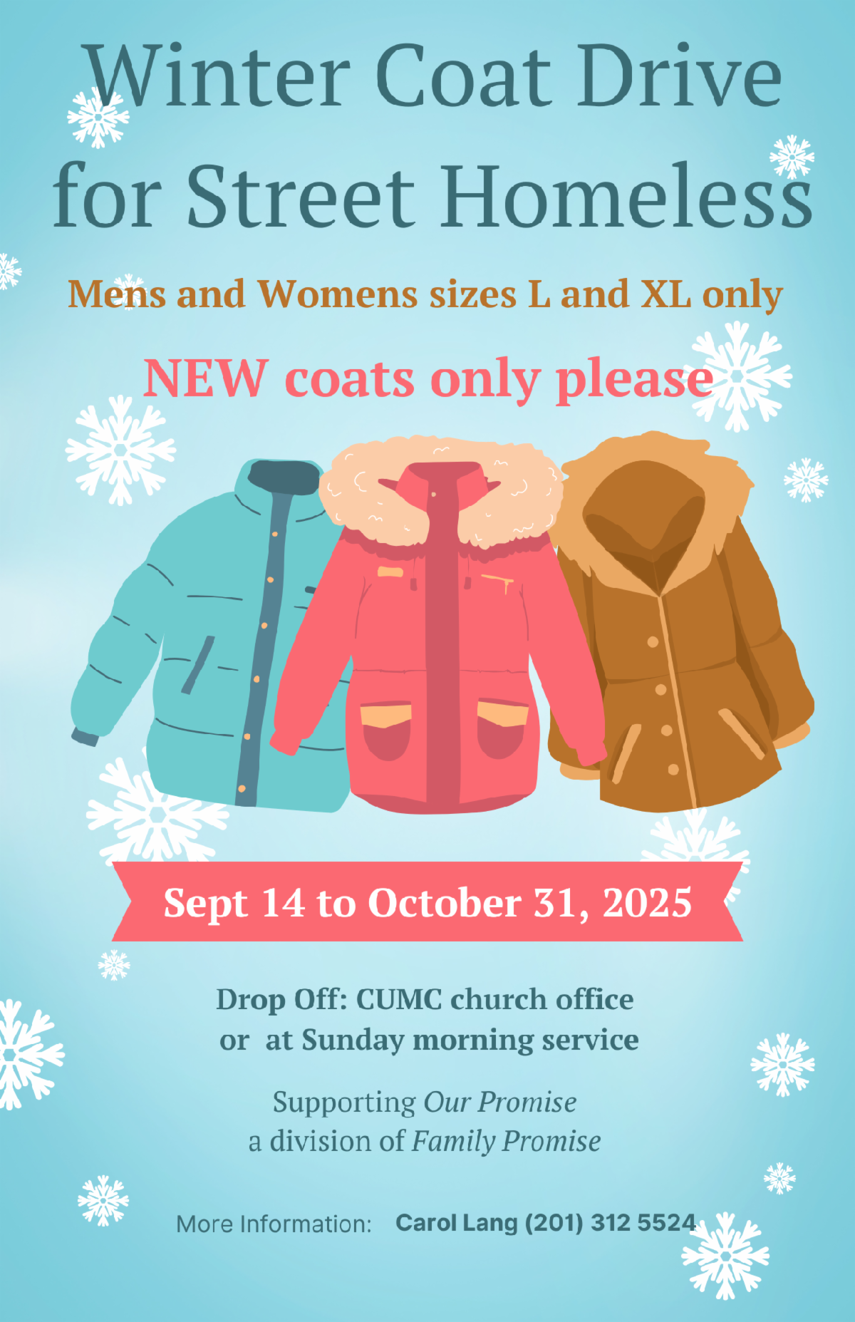 Donations can be dropped off at CUMC in the collection box located in the elevator lobby at the back entrance. See flier below for more information about the drive.