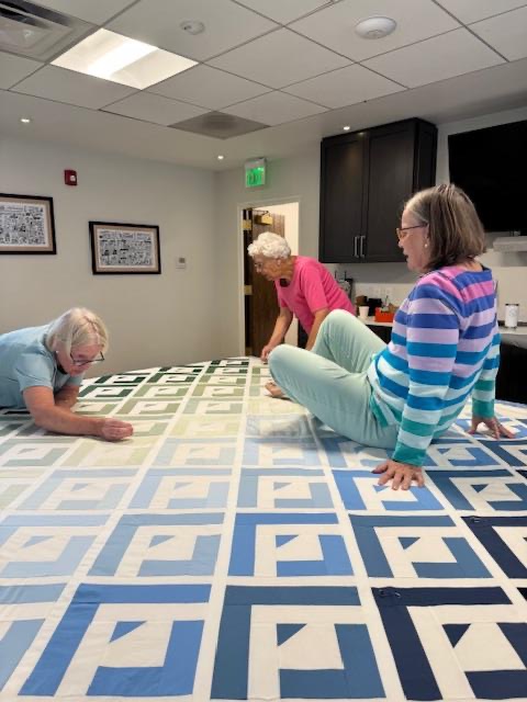 The act of sewing the three layers is called quilting. (left to right - Mariann Ekernas, Ginny Breismeister, Betsy Kreuter.)