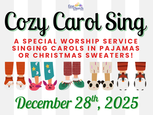 | | Pilgrim Towers Holiday Party | | | First Church Christmas Party | | | Once In Royal David's City Pageant | | | Christmas Eve Worship Schedule | | | Church Building Holiday Closures | | | Cozy Carol Sing Sunday December 28 | | | Adult Faith Formation Opportunities | | | Medicare Part D Assistance | | | |