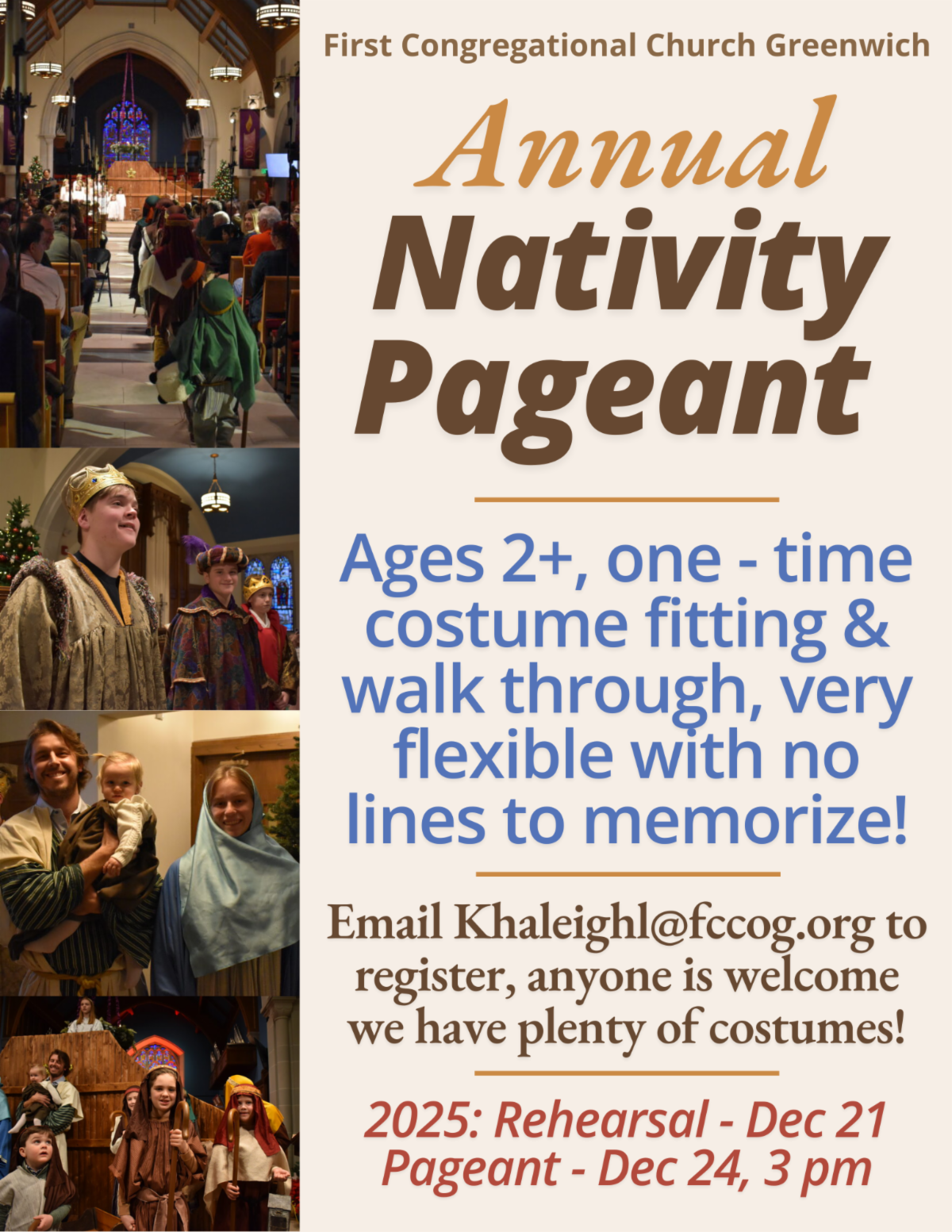 Where: 108 Sound Beach Ave, Old Greenwich. Enter the church’s parking lot from Forest Avenue and park anywhere. Please give the parents dropping off their children lots of room.