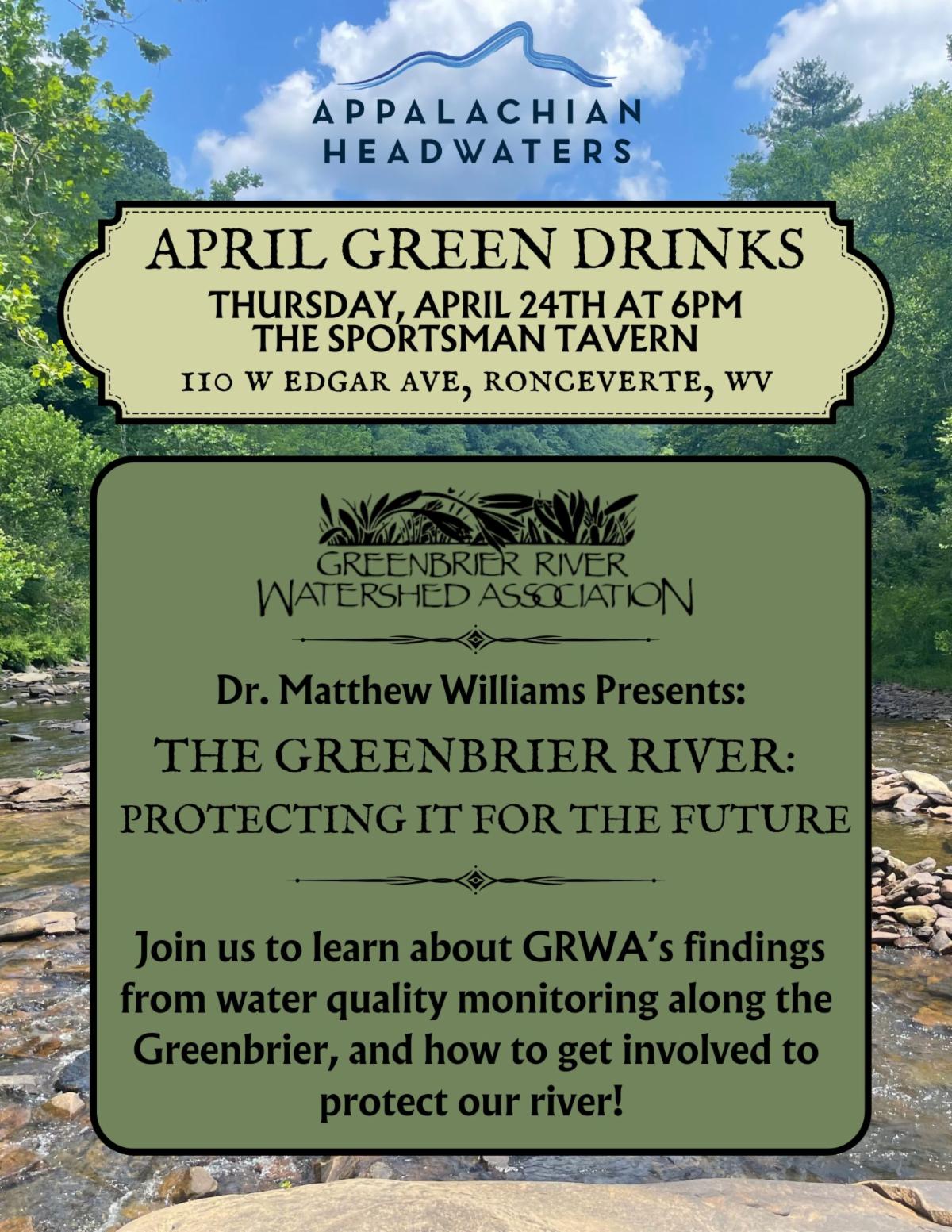 April Green Drinks event series will welcome Dr. Matthew Williams, Associate Professor in the Department of Biomedical Sciences at the West Virginia School of Osteopathic Medicine. Dr. Williams will present "The Greenbrier River - Protecting It for the Future," covering preliminary findings from the Greenbrier River Watershed Association's (GRWA's) water quality monitoring project.