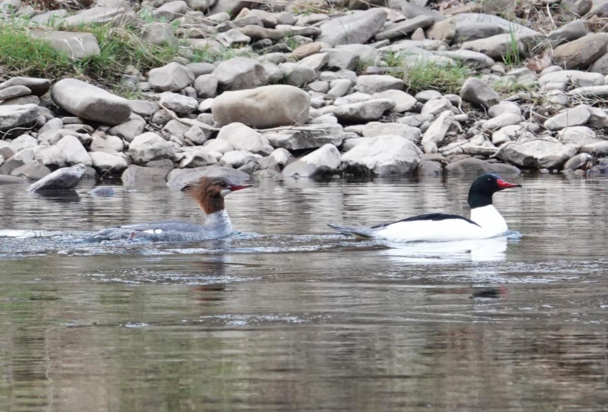While Dr. Bob Must and Adrianne Thackery discuss the testing at Burnsides in Pocahontas County, a pair of Common Mergansers float by.