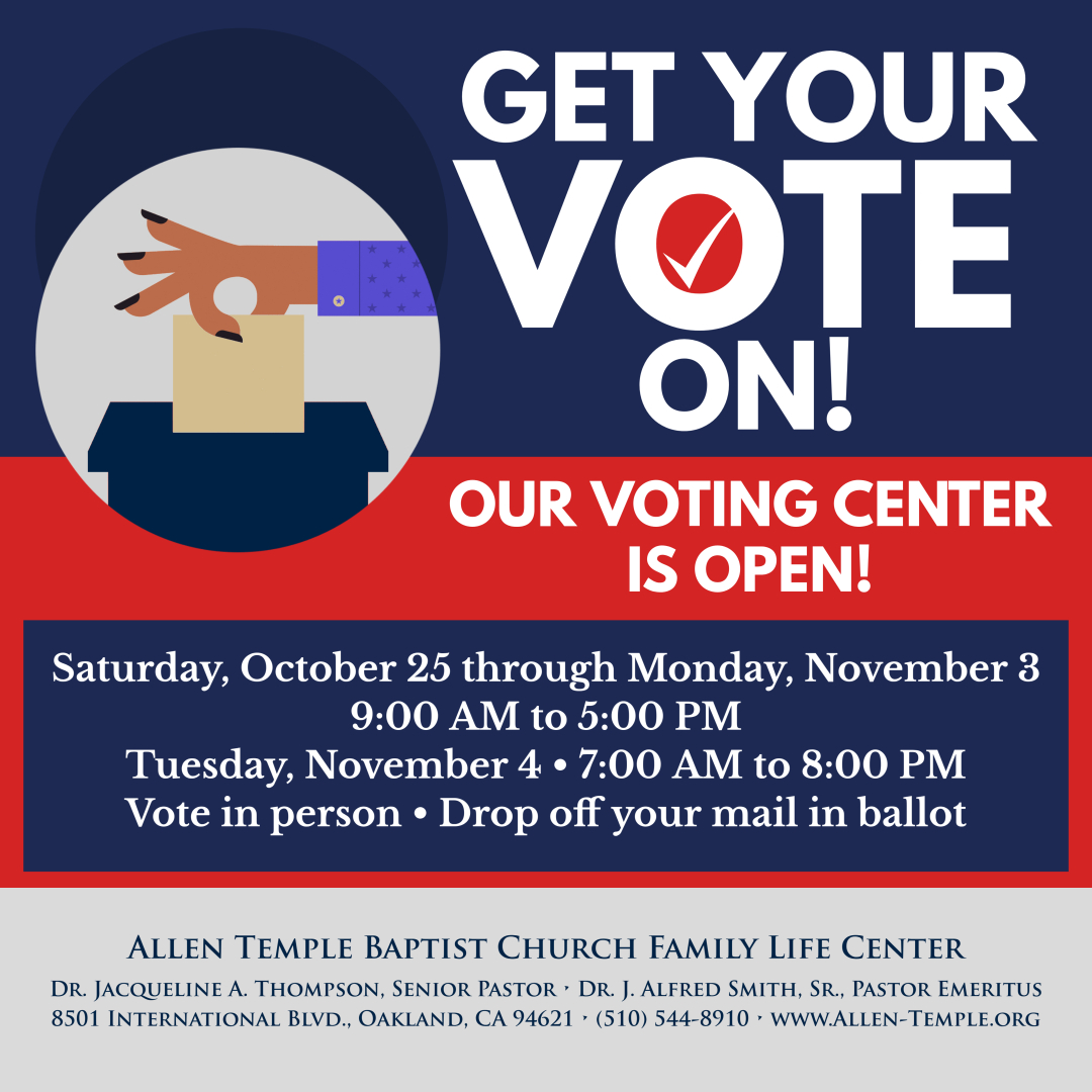 Allen Temple is an official Alameda County Vote Center. Visit the Family Life Center from Saturday, November 1 and Sunday, November 2 from 9:00 AM to 5:00 PM, and Tuesday, November 4 - Election Day - from 7:00 AM to 8:00 PM to vote in person or to drop off your ballot.