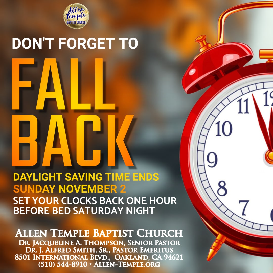 | It's time to fall back! Daylight Saving Time ends Sunday, November 2 at 2:00 AM; don't forget to set your clocks back one hour before bedtime on Saturday night! We'll see you in worship on campus or in the Cyber Sanctuary on Sunday morning at 9:30 AM! | | | | | |