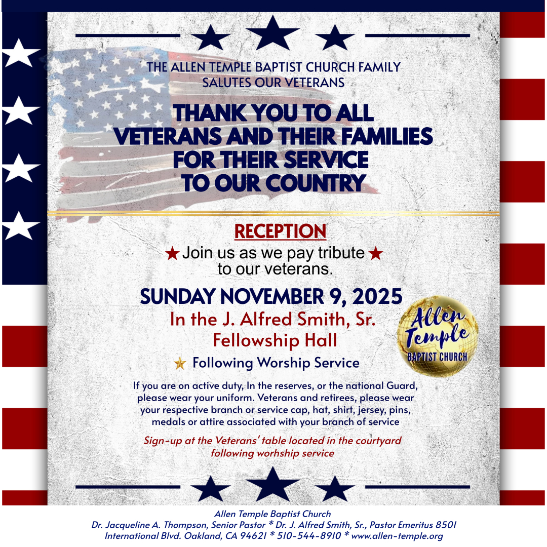 | The Public Ministry invites all to join us in honoring our veterans and their families for their service to our country at our Veterans Reception on Sunday, November 9 following worship in the J. Alfred Smith, Sr. Fellowship Hall. Veterans, active duty, and reservists are encouraged to wear their uniform or branch-related attire. Veterans may sign up for recognition at the Veterans’ Table in the courtyard following worship. | | | | |