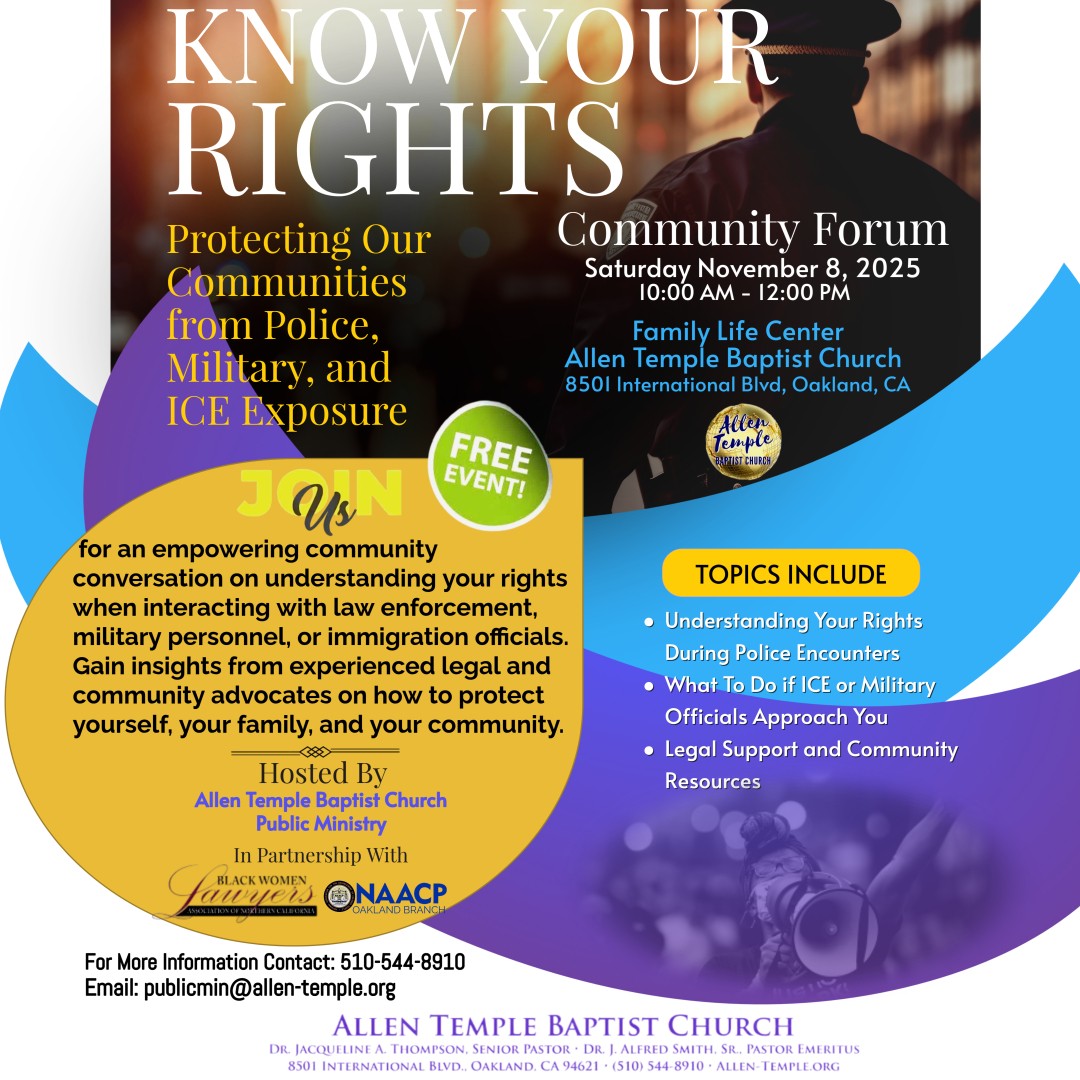 On Saturday, November 8 from 10 AM to Noon in the Family Life Center, the Public Ministry along with the Black Women Lawyers and the Oakland Chapter of the NAACP invites you to a powerful Know Your Rights Community Forum focused on protecting our communities from police, military, and ICE exposure.