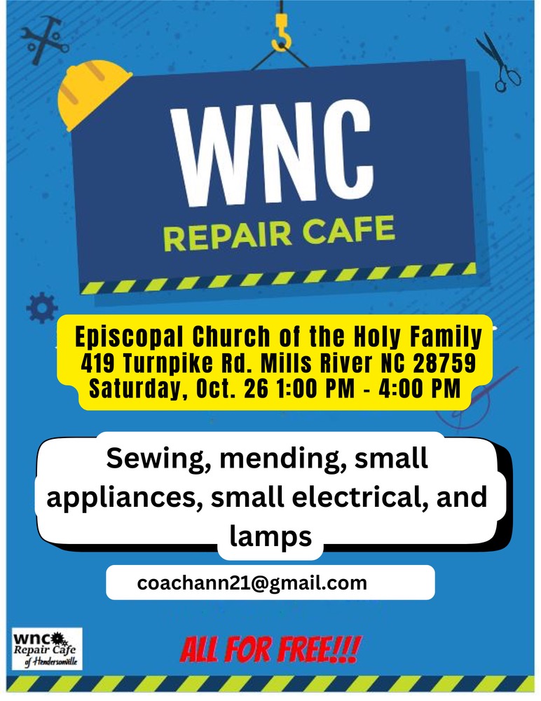 Holy Family Church is excited to host the Henderson County chapter of WNC Repair Café. The mission of the WNC Repair Café embodies repair, restoration, sustainability, and community–qualities we acclaim at this time of recovery in Western North Carolina. Volunteers will make small sewing and mending repairs, and will also offer repairs of small electronics, appliances, and lamps.