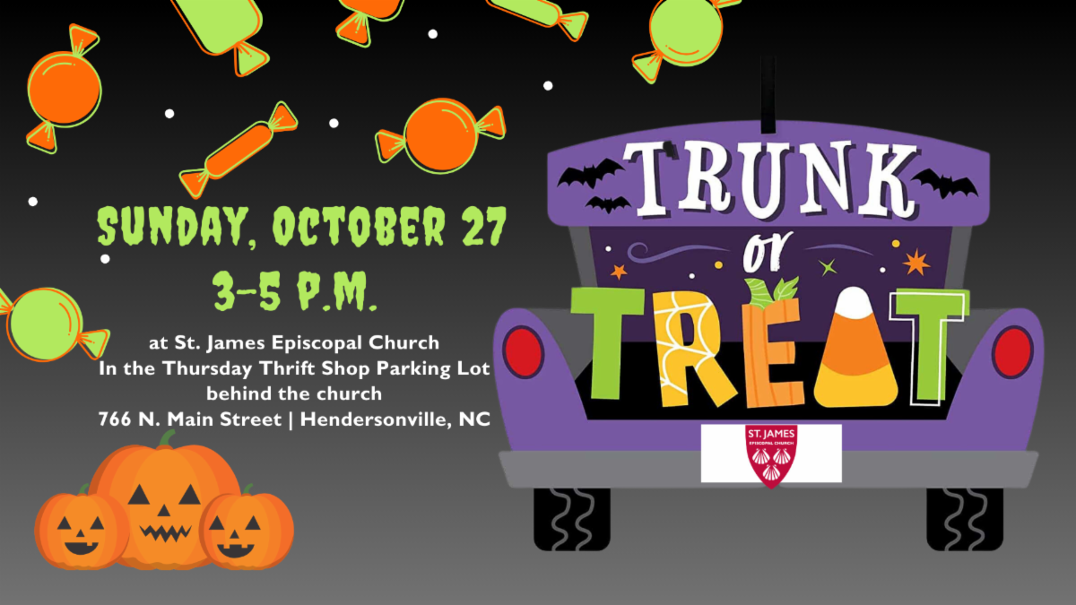 Tell all your friends that St. James Episcopal Church in Downtown Hendersonville is hosting a Trunk-or-Treat! All are welcome to join us for lots of FUN and CANDY on Sunday, Oct. 27 from 3-5 p.m. in the Thursday Thrift Shop parking lot behind the church. We can use the help of volunteers to decorate their vehicles and hand out candy, welcome guests, serve hot chocolate, and direct parking. Contact Diane King at (828) 674-1461 or echomtn1@yahoo.com if you would like to help. Everyone is invited to come and participate!