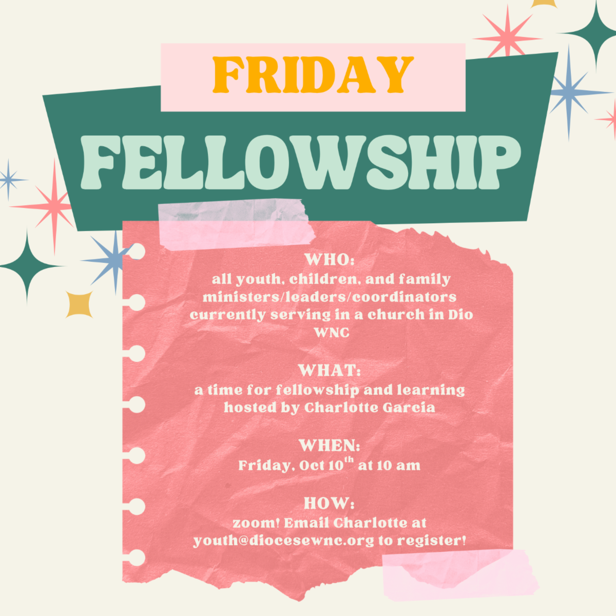 Charlotte is hosting a zoom gathering called “First Friday Fellowship” for children/youth leaders of our churches, these can be volunteers or paid professionals who support and lead formation to the youth and children. The purpose of this group is to share resources, encourage one another, and share ideas.
