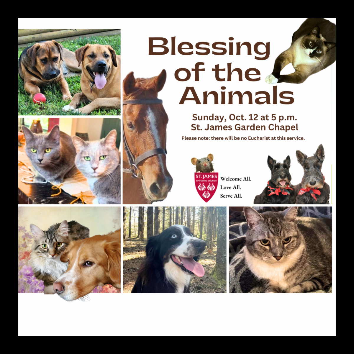Your furry, feathered, or even scaly friends are welcome at our outdoor Blessing of the Animals service as we celebrate the Feast of St. Francis of Assisi and God’s creation. Allelu!, our contemporary music group, will join us to provide music. There will be no Eucharist at this service.