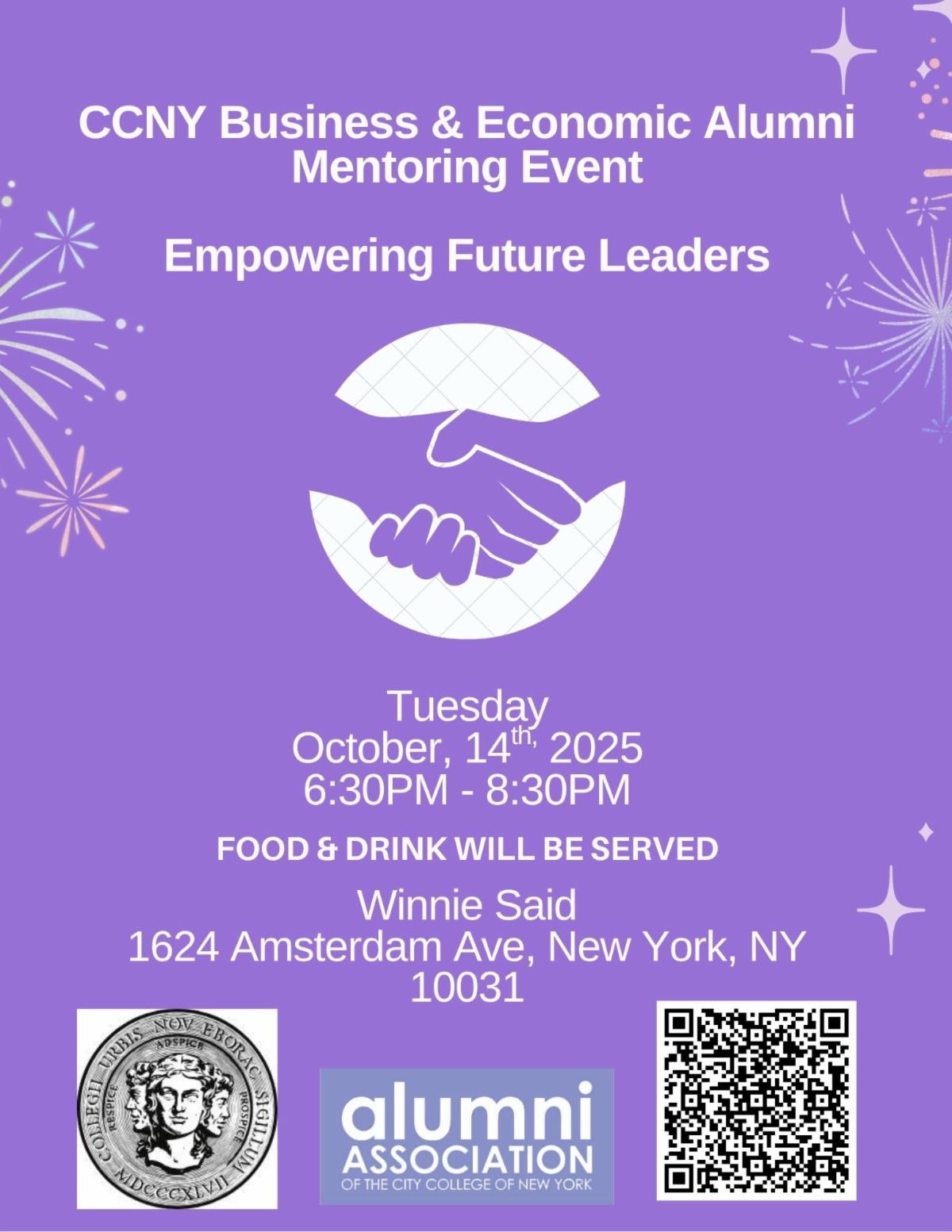 Click the flyer for more information. All CCNY alumni are invited to join an evening dedicated to inspiring and connecting with the next generation of leaders in business and economics.