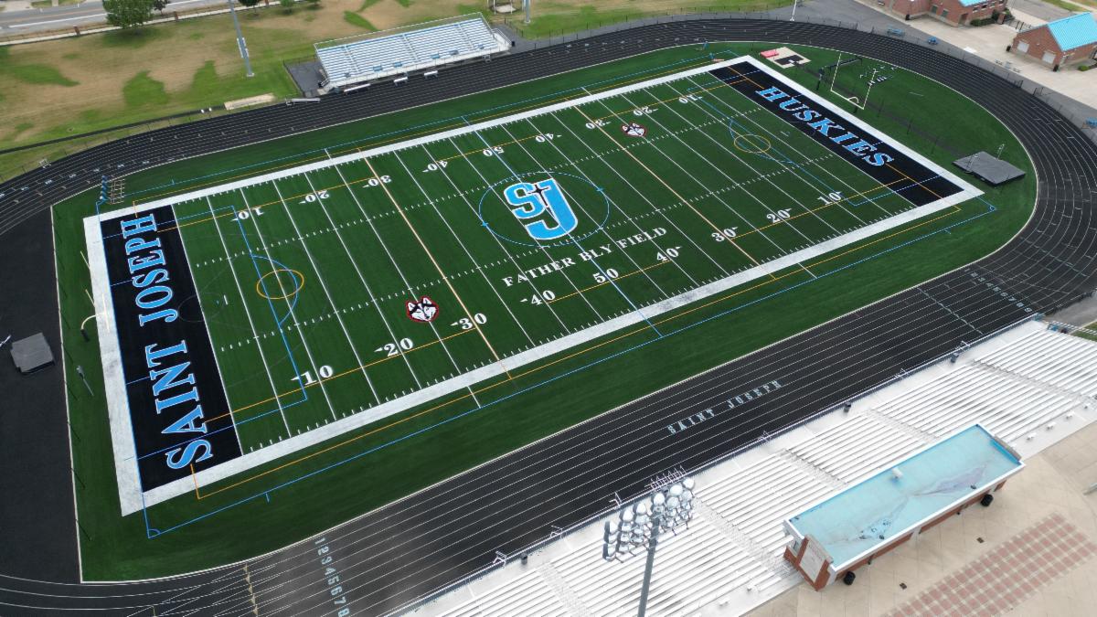 The summer activity at Saint Joe has certainly kept the momentum for Saint Joe Athletics moving forward with significant facility upgrades. The new look for the Huskies includes the installation of new turf on Father Bly Field, rebranding of Alumni Gym with a new court design and student-athlete and team accomplishment banners, additional branding in the Auxiliary Gym and a wrap on the visiting football bleachers.