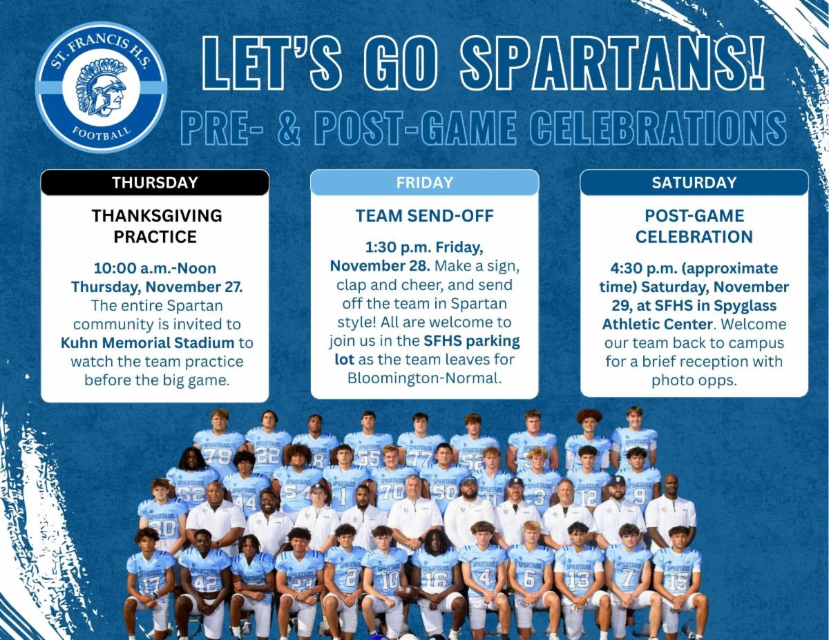 Spartan Football advanced to the Championship Game of the IHSA Finals! They play Providence Catholic High School at 10:00 a.m. on Saturday, November 29, at Hancock Stadium at Illinois State University. Purchase tickets here.