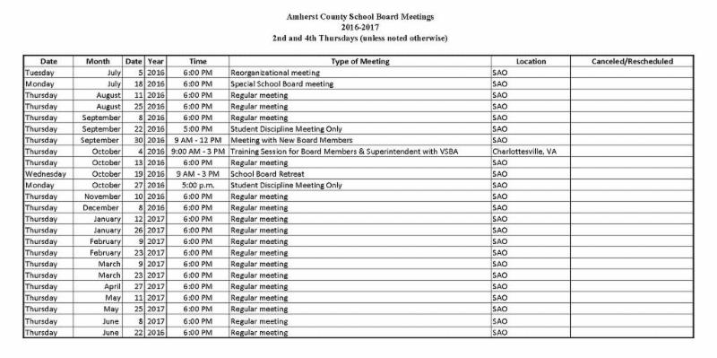 Amherst County School Board Meeting Schedule ~ 2016-2017