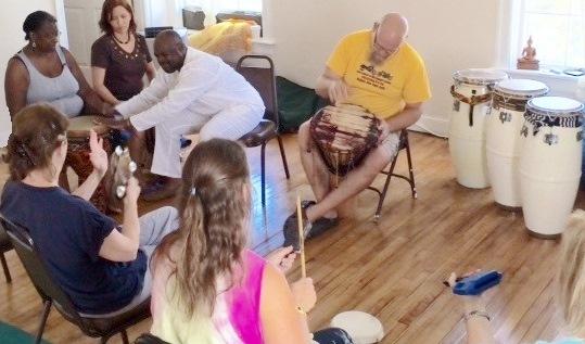 a new participant dropped into drum class. She had never beat on a drum before and here Malcolm had her banging different sounds on one of our extra conga drums. It's not difficult to learn where bass tones are played on a drum, or to find the position for tone sounds.