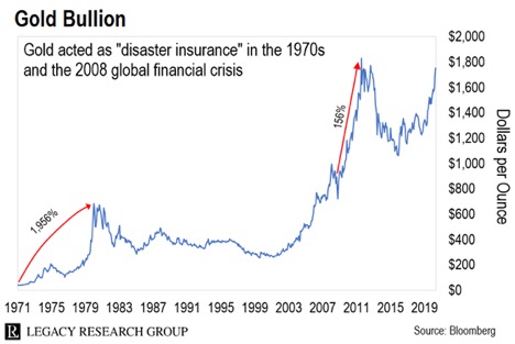 As you can see, gold rose 1,956% between 1971 and 1980. That was during the 1970s – a decade marked by economic crisis.
