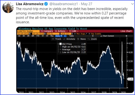 We also see the same price-goosing with bonds. Corporate bonds are now once again approaching historically low yields which means, in the see-saw language of bonds, they are almost as pricey as they’ve ever been. In history: