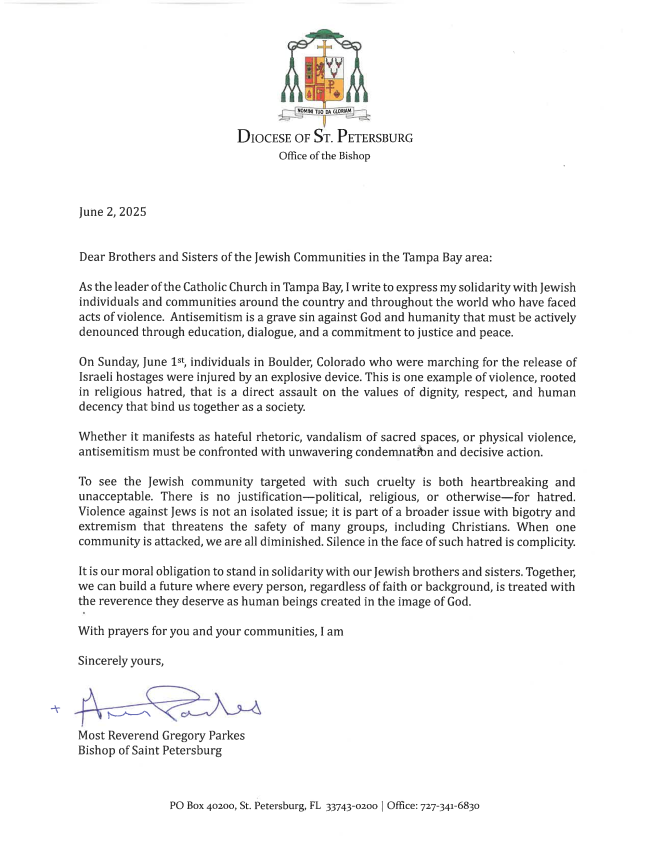 The Center for Catholic-Jewish Studies would like to share the below letter to the Jewish Communities of Tampa Bay written by Bishop Gregory Parkes of the Roman Catholic Diocese of St. Petersburg. We are horrified by another attack on Jews in the United States. As the CCJS has stated in previous messages, there is never any political or social justification for targeting individuals and communities because of who they are.