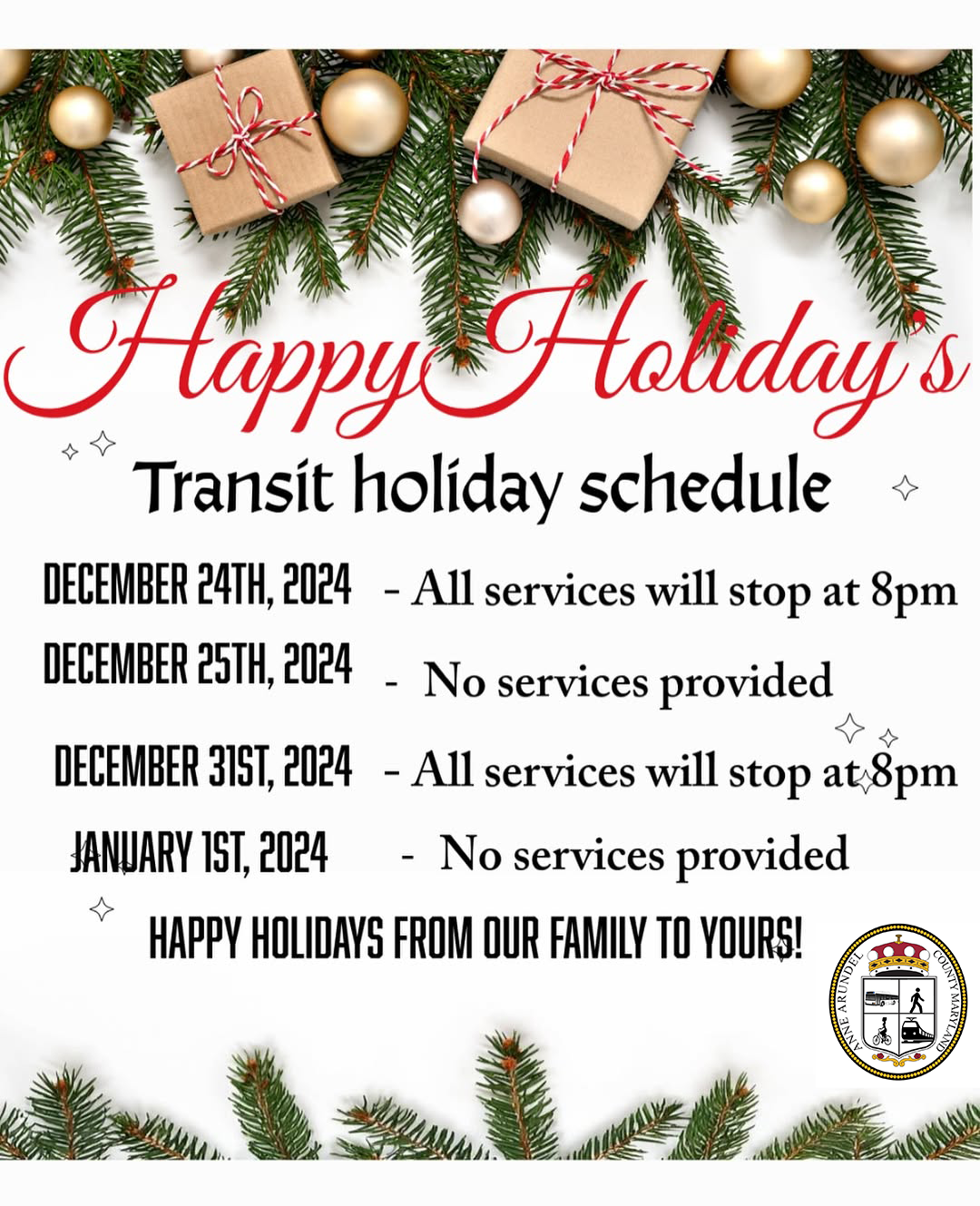 All senior activity centers will be closed from Tuesday, December 24th through Wednesday, January 1st. They will reopen on Thursday, January 2nd, 2025. The Senior Center Plus Program and transportation service to senior activity centers will not occur during the holiday closure, but they will resume on Thursday, January 2nd, 2025. Lunch will not be served at the senior activity centers during the closure, but lunch will be served at all other congregate nutrition sites.
