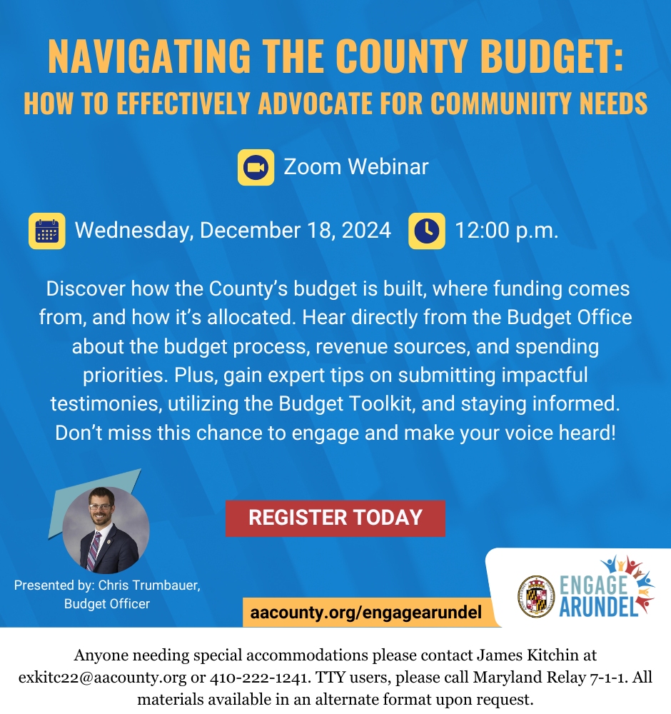 Anne Arundel County recently earned the prestigious Budget Presentation Award, a testament to transparency and collaboration in our budgeting process. If you are curious about the County budget process and how you can be part of it, join us next week on December 18th at noon for our next EngageArundel webinar, Navigating the County Budget. This webinar will prepare you to participate in a Budget Town Hall in your district, where County Executive Pittman and your Councilmember are eager to hear your priorities for the next fiscal year. Dates and details on the Town Halls are below—don’t miss this opportunity to make an impact!