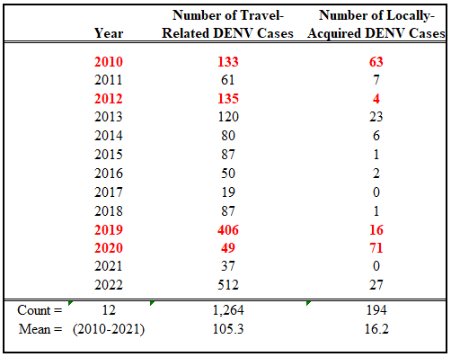 Table1. The relationship between the numbers of reported travel-related dengue cases and outbreaks of locally-acquired dengue from 2010 through October of 2022.