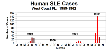 From 1959 through 1962 more than 300 cases of St. Louis encephalitis were reported in the Tampa Bay area of Florida (Figure 2). A notable feature of these SLE epidemic years was the absence of cases in 1960, a year when the powerful Hurricane Donna tracked up the west coast of Florida (Figure 3).