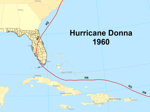 Figure 3. Track of Hurricane Donna from August 29 through September 14, 1960.