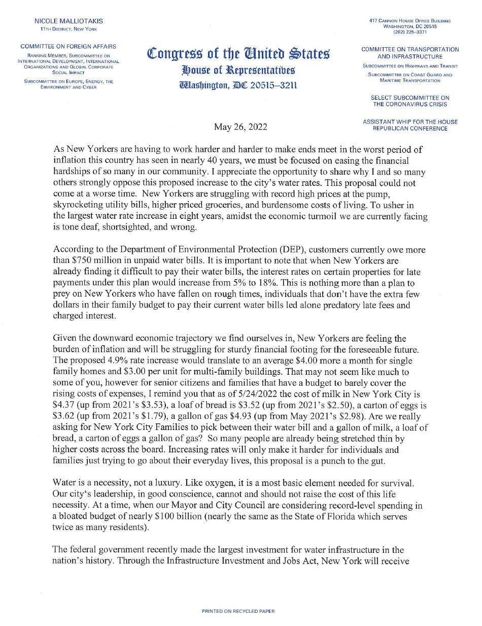 New Yorkers are struggling with record high prices at the pump, skyrocketing utility bills, higher-priced groceries, and burdensome costs of living. To usher in the largest water rate increase in eight years, amidst the economic turmoil we are currently facing is tone-deaf, shortsighted, and wrong. Read my testimony by clicking the button below.